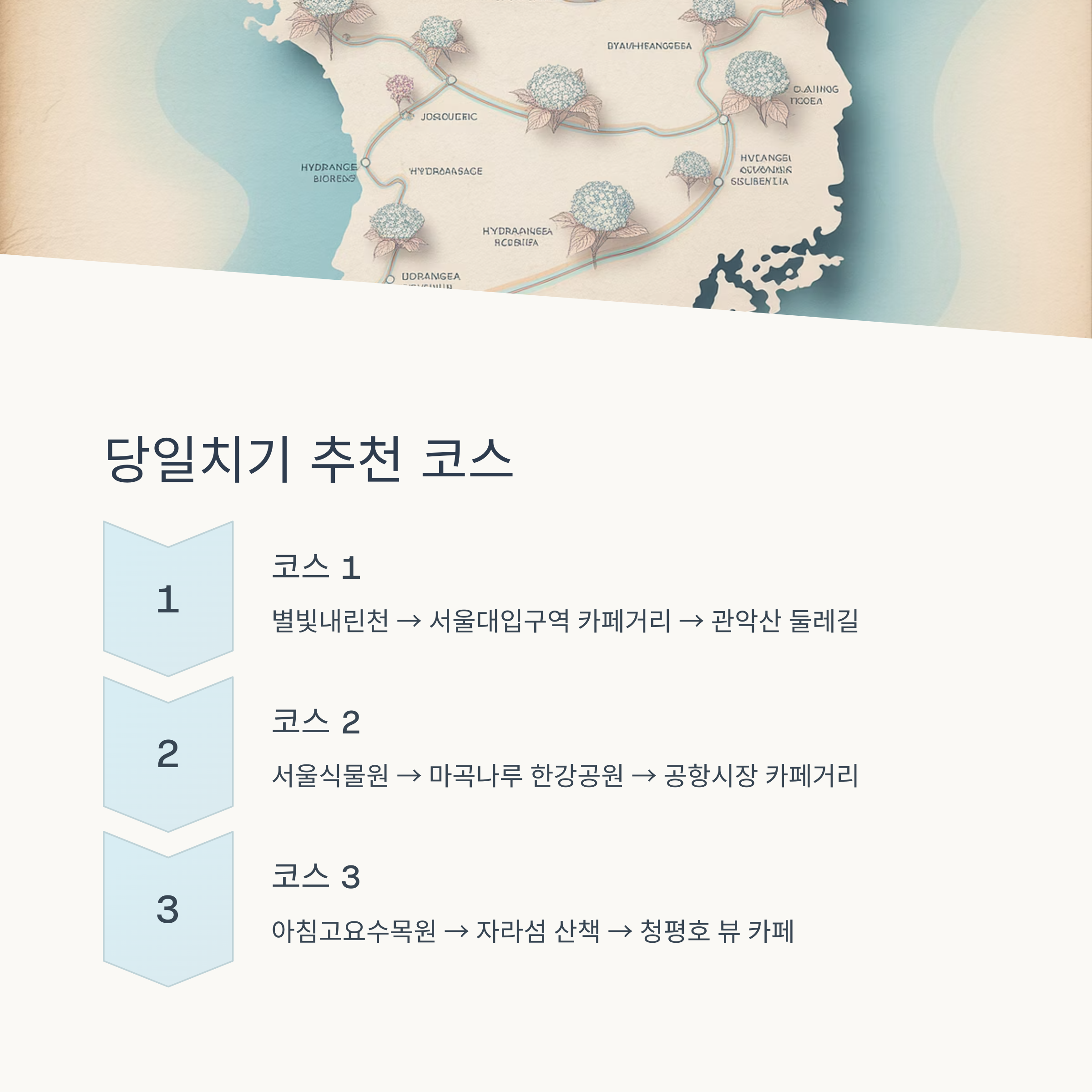 이들 서울수국명소는 모두 도보 산책이 가능하며, 도심 속 자연을 가까이에서 만끽할 수 있는 공간입니다.
