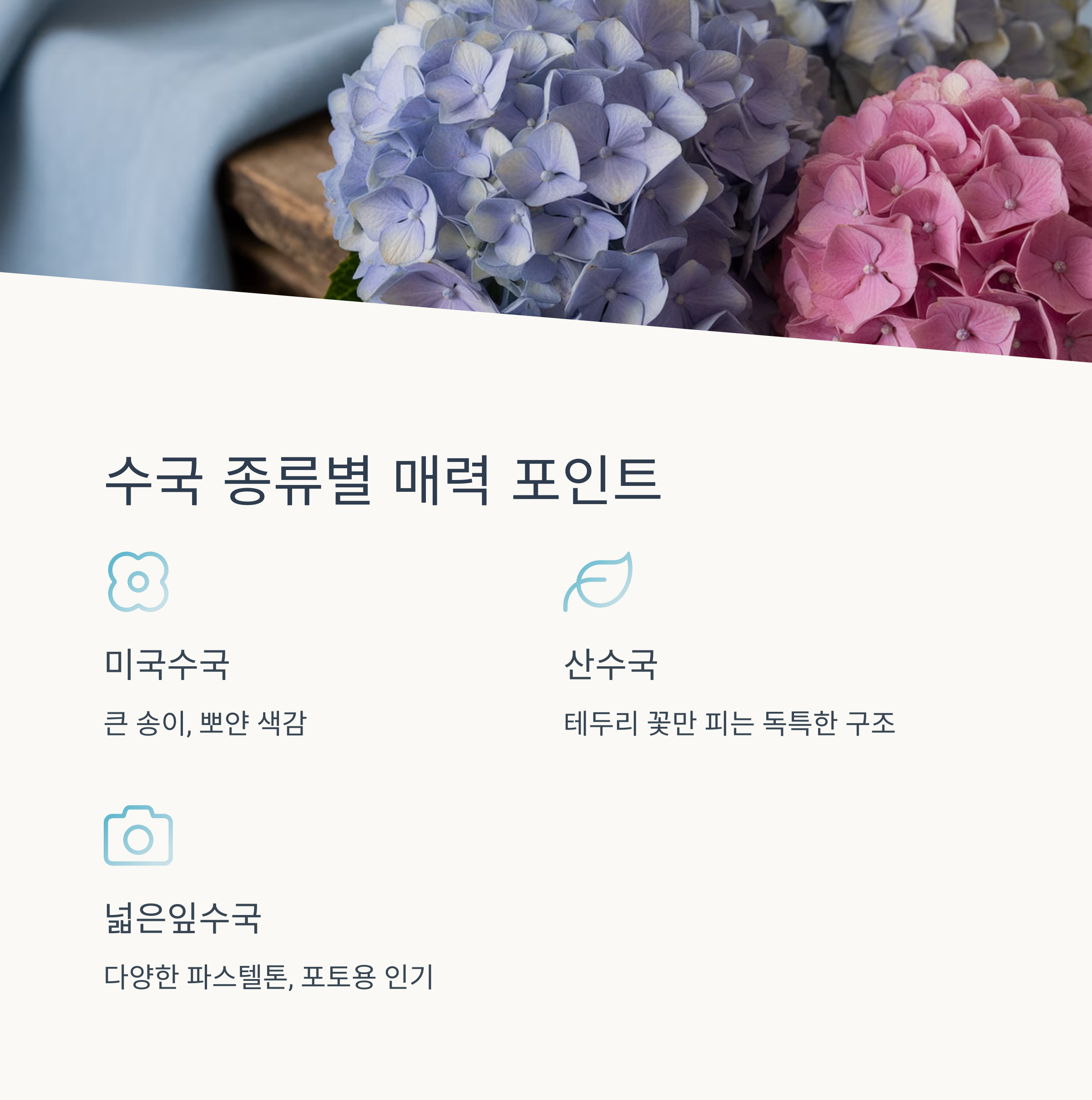 - 넓은잎수국: 다양한 파스텔톤과 포토용으로 인기