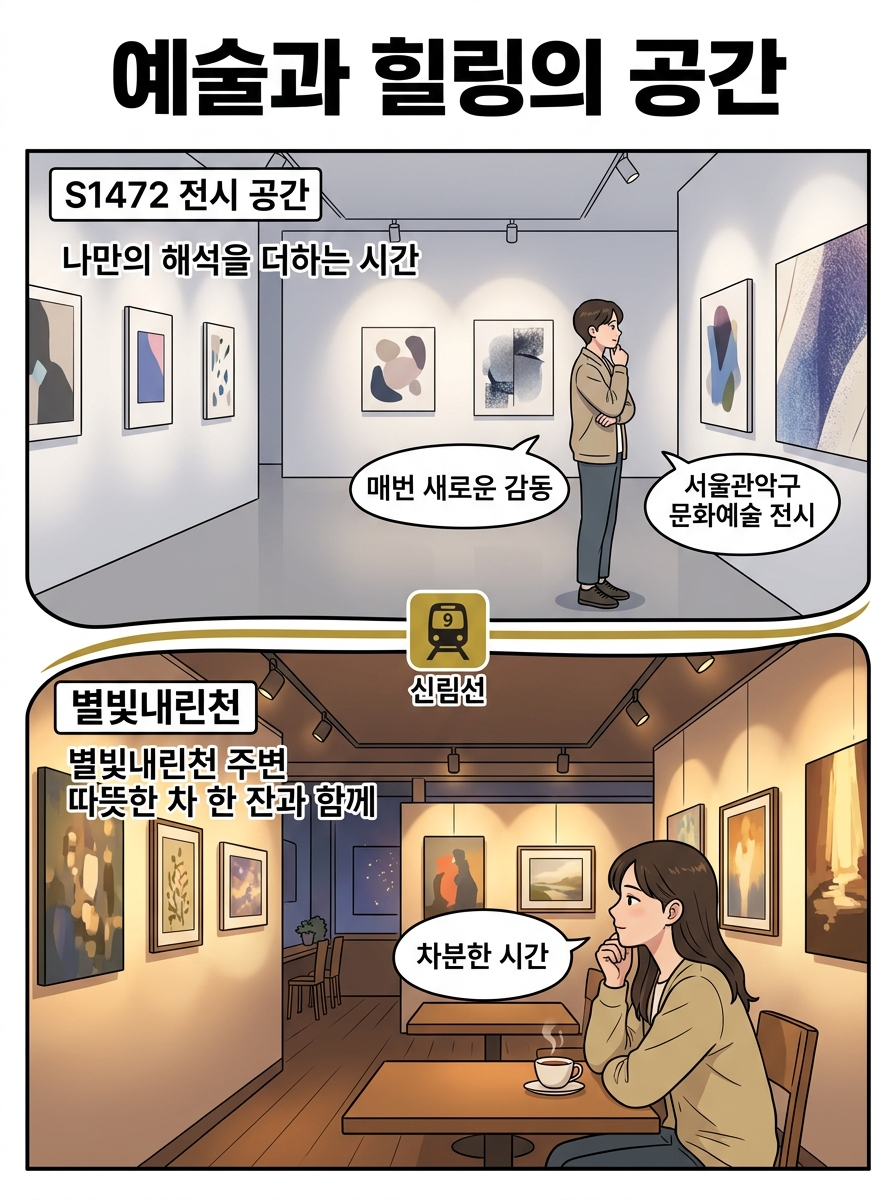 다들 신림선 타고 관악구 여행하는 거 아는 사람은 아는데, 특히 S1472와 별빛내린천은 혼행족에게 완전 추천하고 싶은 실내 명소예요. 서울관광재단과 관악문화재단에서 선정한 곳이라 더욱 믿음이 갔어요.