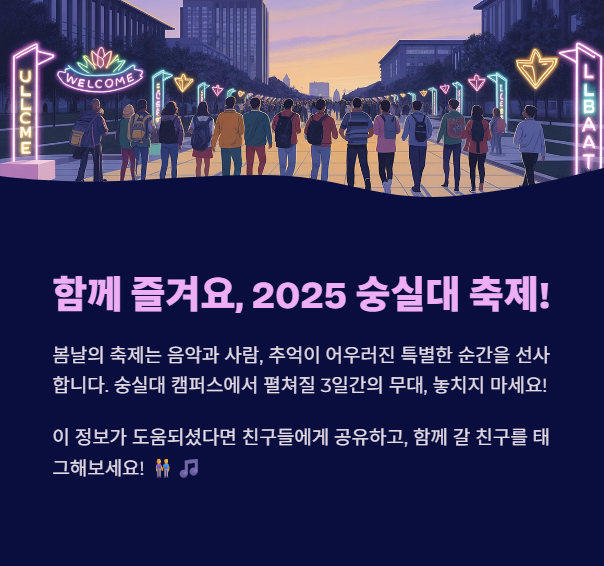 2025년 숭실대 봄 축제 일정과 함께 라인업, 입장 정보, 방문 팁까지 한눈에 정리해드립니다.
