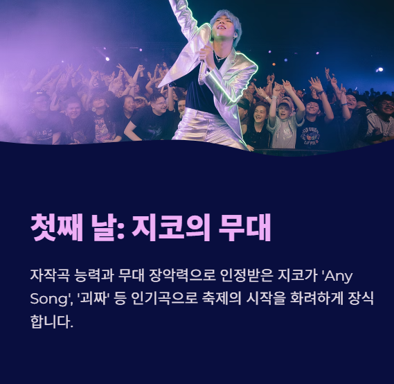 첫날의 무대는 지코가 장식합니다. 자작곡 능력과 무대 장악력, 다양한 장르 소화 능력으로 이미 대중성과 실력을 모두 인정받은 아티스트입니다. 'Any Song', '괴짜' 등 인기곡으로 신나는 분위기를 만들 예정입니다.