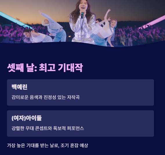A. 마지막 날의 백예린과 (여자)아이들 무대에 대한 기대감이 높습니다.