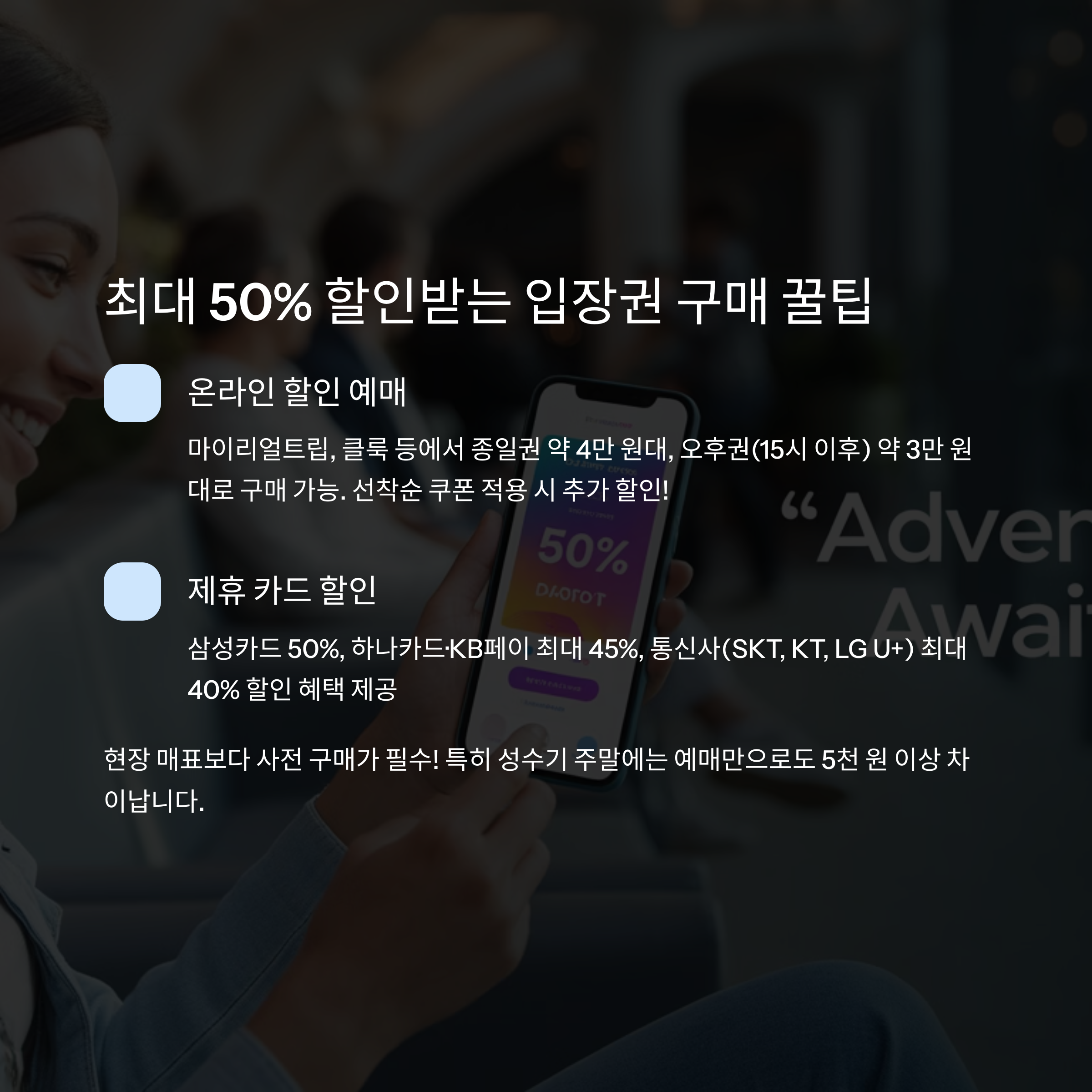 ※ 현장 매표보단 사전 구매 필수, 특히 성수기 주말엔 예매만으로도 5천 원 이상 차이 납니다.
