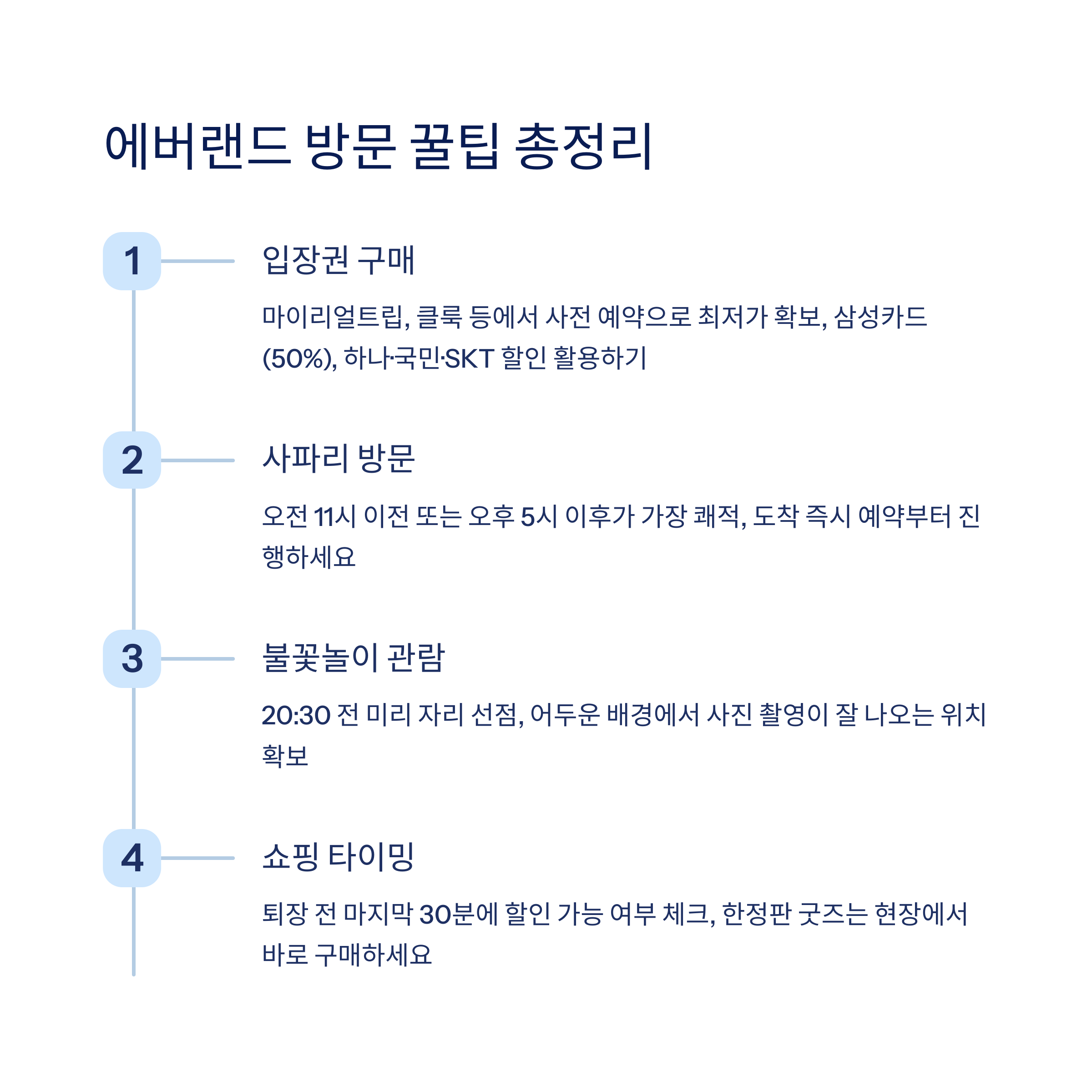 6월 중순 이후, 꽃축제 시즌이 끝난 시점에서 에버랜드를 200% 즐기고 싶다면, 입장권 할인부터 여름 인기존인 사파리월드·로스트밸리, 하루의 대미를 장식할 야간 불꽃놀이, 그리고 여름 한정 굿즈 쇼핑 팁까지 꼭 확인해 보세요.