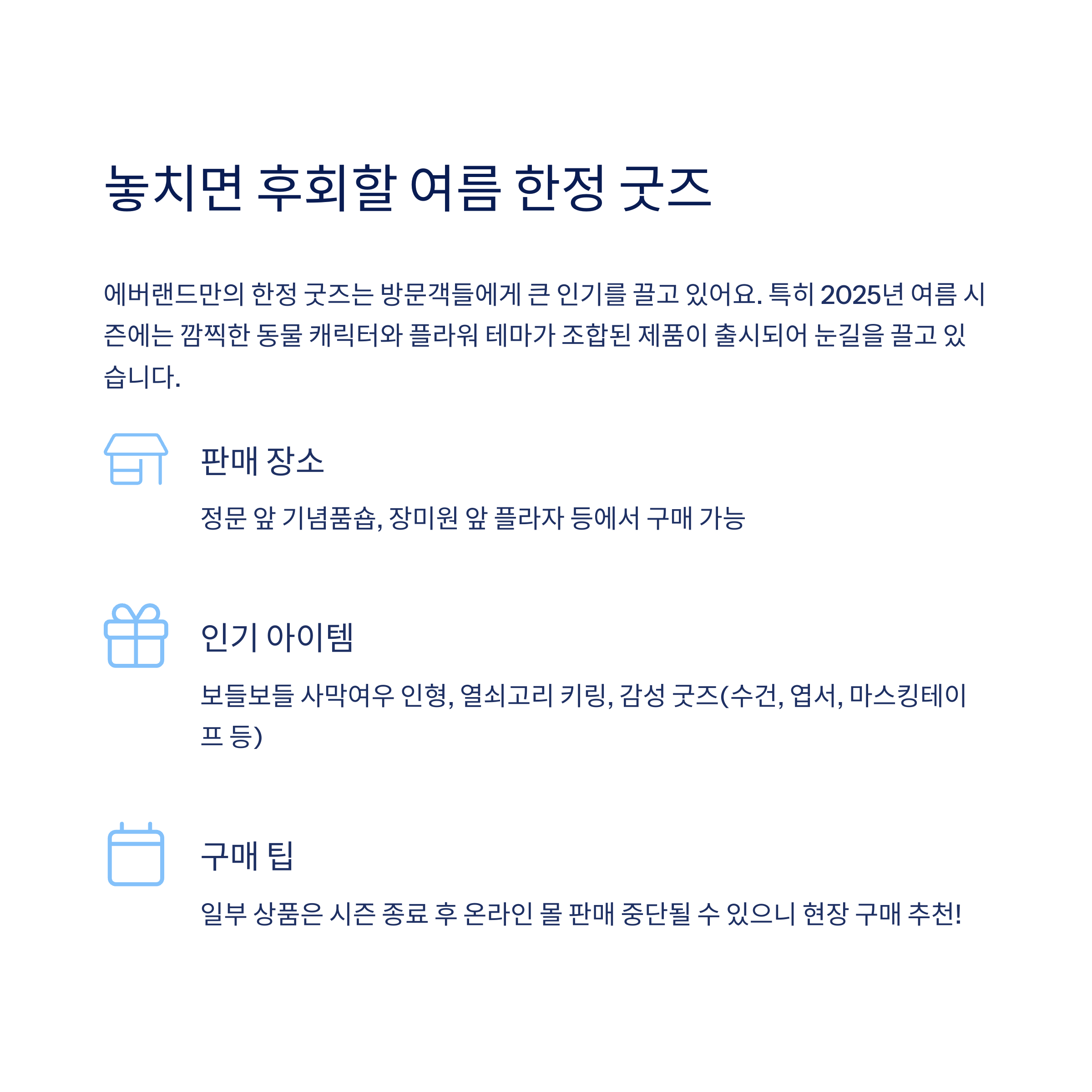 에버랜드만의 한정 굿즈는 방문객들에게 큰 인기를 끌고 있어요. 특히 2025년 여름 시즌엔 깜찍한 동물 캐릭터와 플라워 테마가 조합된 제품이 출시돼 눈길을 끌고 있어요.