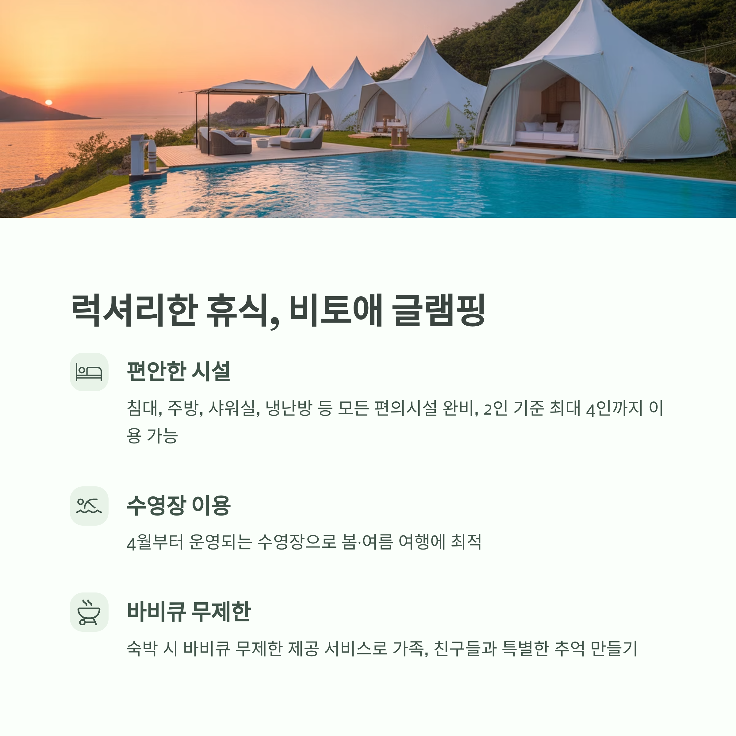 요즘 여수여행의 새로운 트렌드는 바로 글램핑입니다. 여수 돌산도에 위치한 ‘비토애 글램핑’은 럭셔리한 시설을 갖춘 숙소로, 바다 뷰가 인상적인 곳이에요.