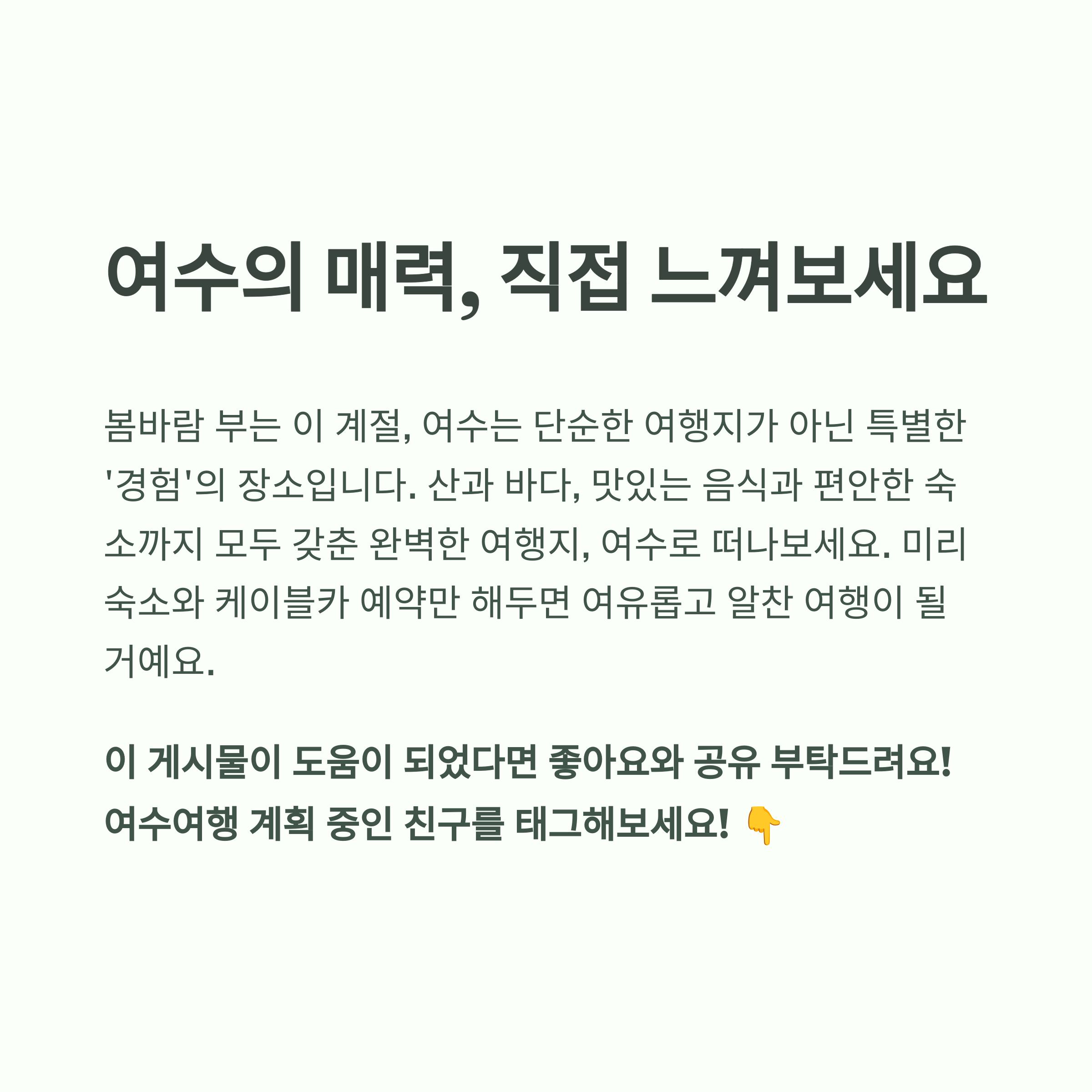 봄바람 부는 날씨에 어디론가 떠나고 싶다면, 지금이 바로 여수여행을 떠나기 좋은 시기입니다. 산, 바다, 먹거리, 숙소까지 모두 갖춘 여수는 단순한 여행지가 아니라 ‘경험’의 장소예요.