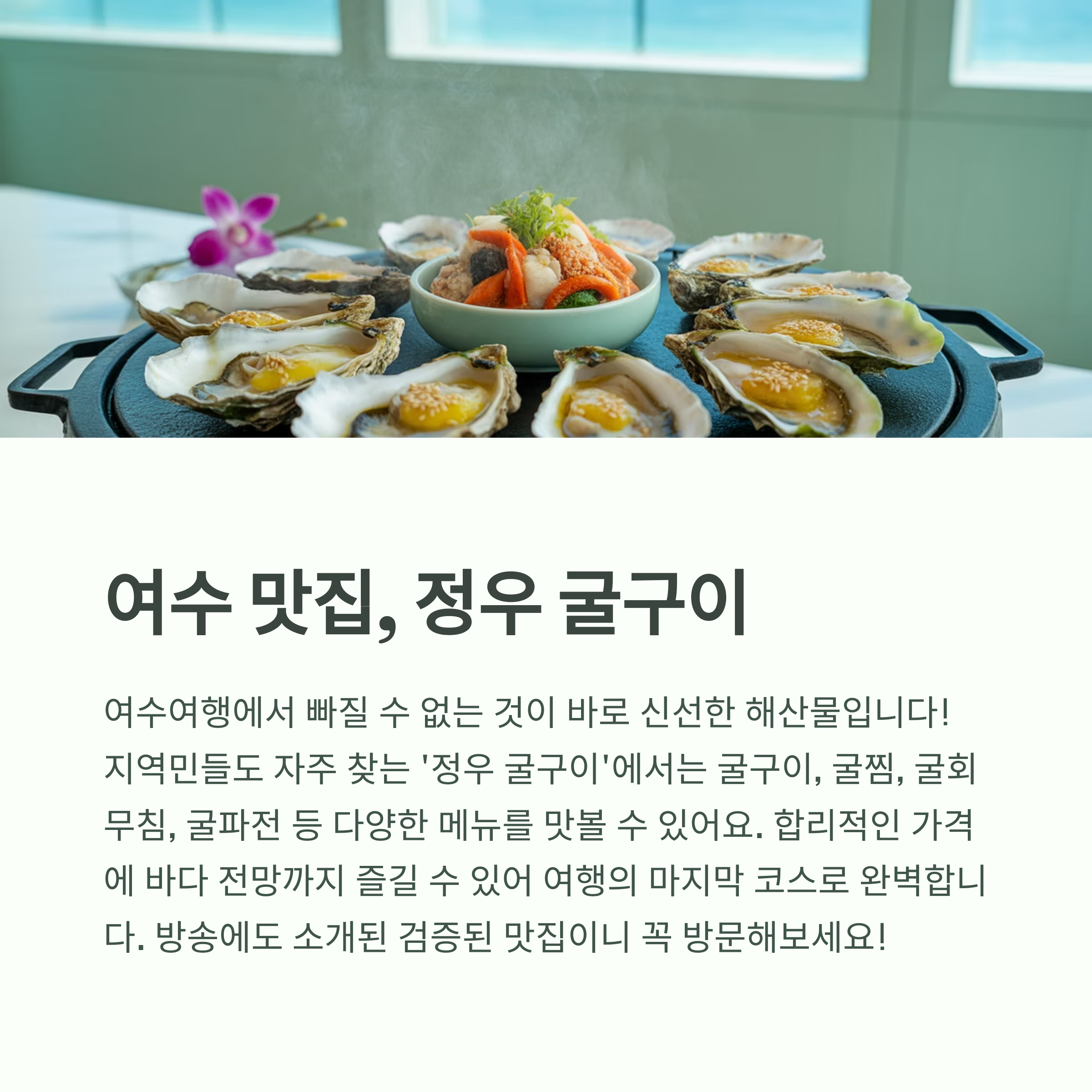 여수여행하면 빠질 수 없는 게 바로 해산물입니다. 그중에서도 정우 굴구이는 지역민도 자주 찾는 맛집으로 알려져 있어요.