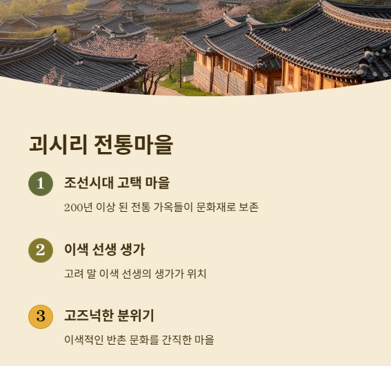 고려 말 이색 선생의 생가를 비롯해 200년 이상 된 전통 가옥들이 문화재로 보존되어 있어, 산책하듯 둘러보기에 좋아요.