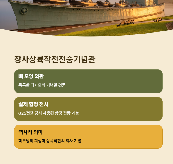 6.25 전쟁의 숨은 역사 중 하나인 장사상륙작전을 기리는 기념관으로, 독특한 배 모양 외관과 실제 함정 전시가 인상적인 장소입니다.