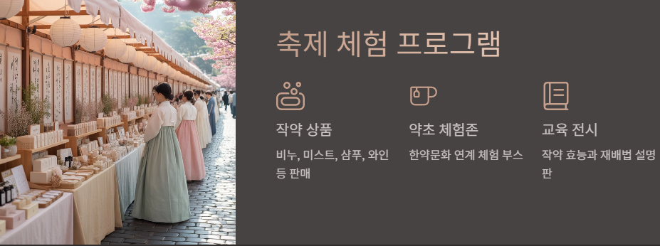 - 약초 체험존 및 홍보 부스: 한약문화와 연계