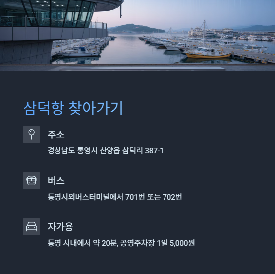 - 자가용: 통영 시내에서 약 20분 소요 / 삼덕항 공영주차장 이용 가능 (1일 5,000원)