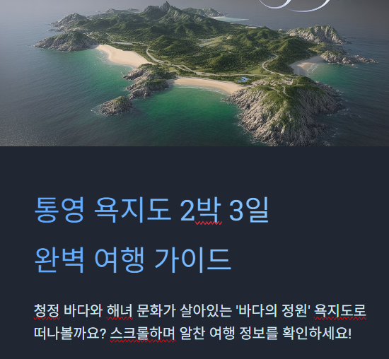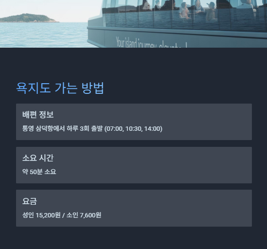 - 편의시설: 욕지항 근처에 소형 마트, 약국, ATM 있음 / 미리 준비 필수
