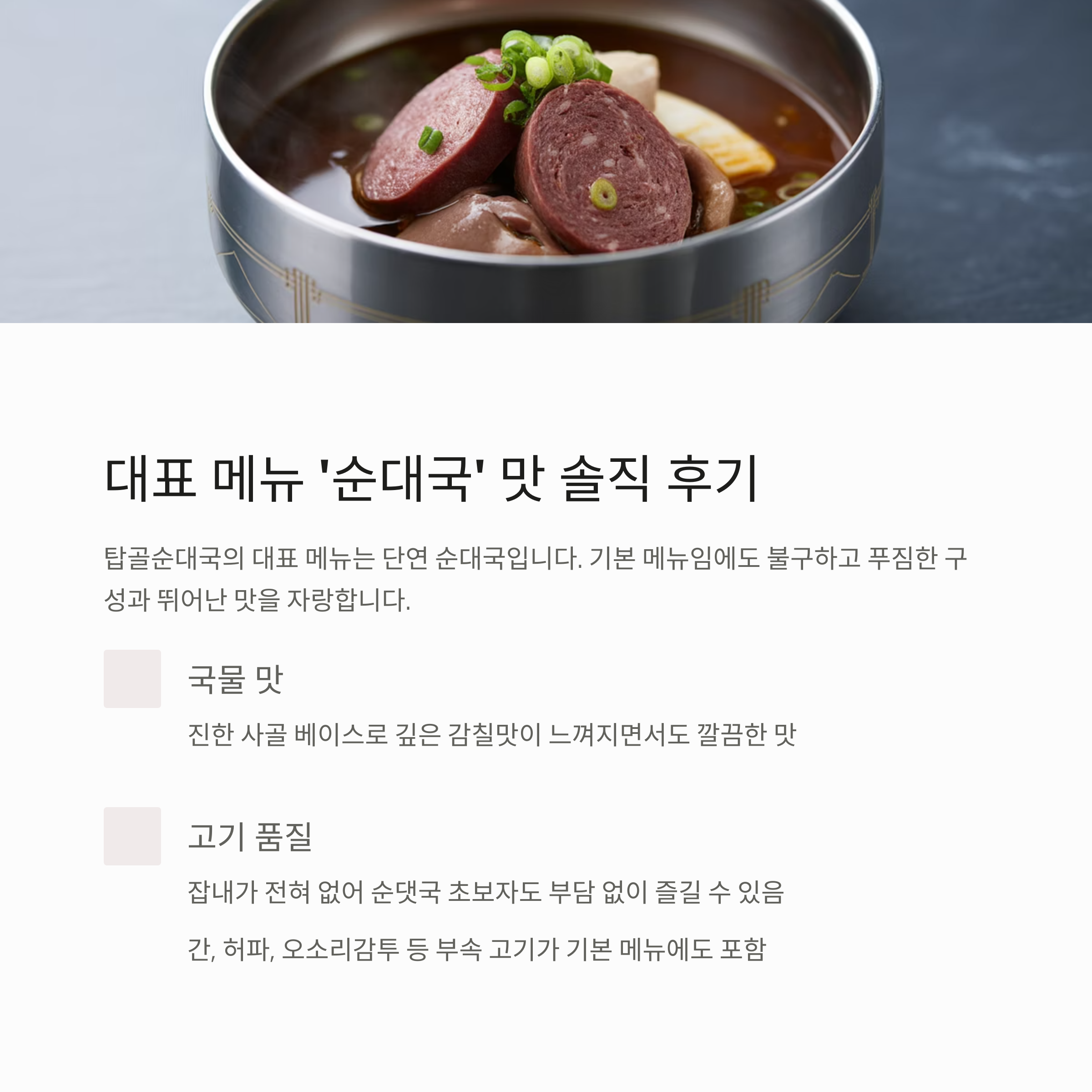 - 고기 품질: 고기에서 잡내가 전혀 나지 않아 순댓국 초보자도 부담 없이 맛있게 즐길 수 있습니다.