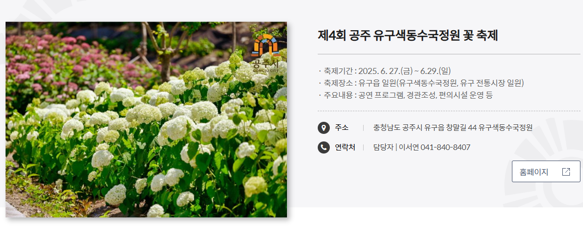 - 유구 색동수국정원꽃 축제 공식사이트:https://www.gongju.go.kr/prog/tursmCn/tour/sub03_01_07/view.do?cntno=66