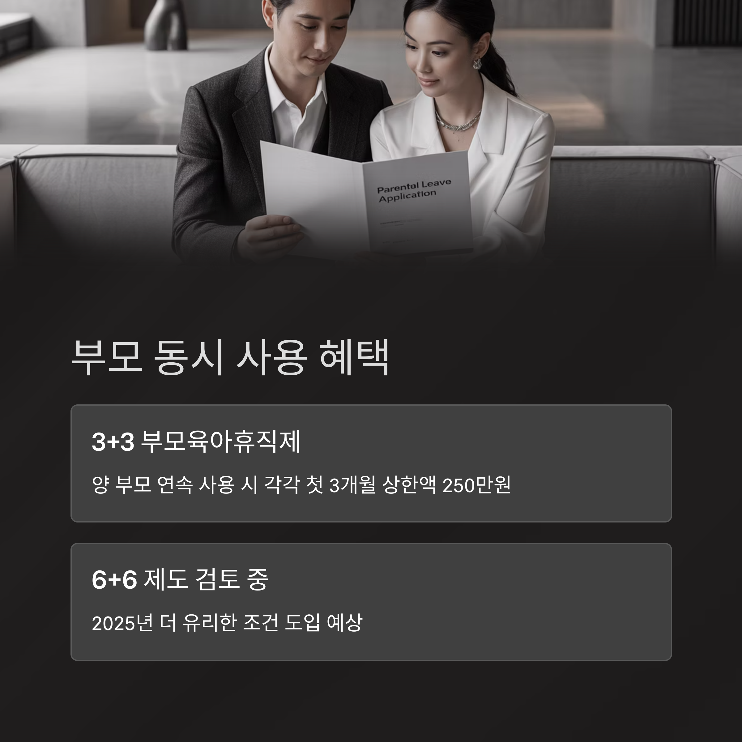- ‘3+3 부모육아휴직제’: 양 부모가 연속 사용 시 첫 3개월 급여 상한액 각각 250만 원