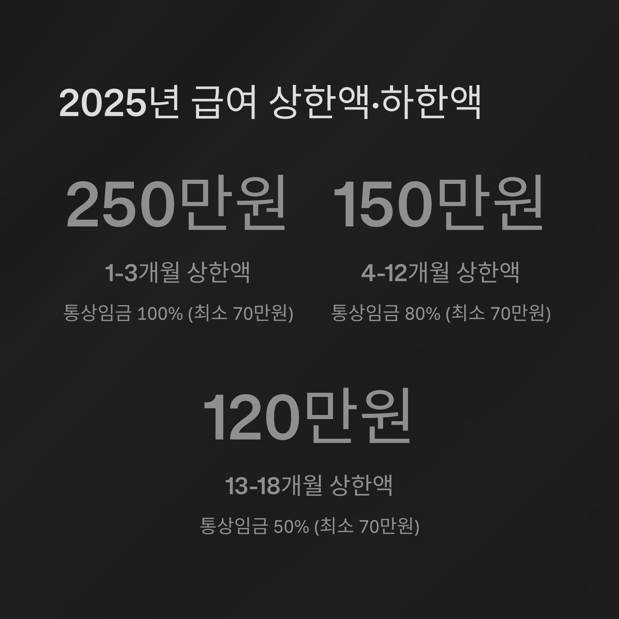 | 1~3개월차 | 통상임금의 100% | 월 250만원 | 월 70만원 |