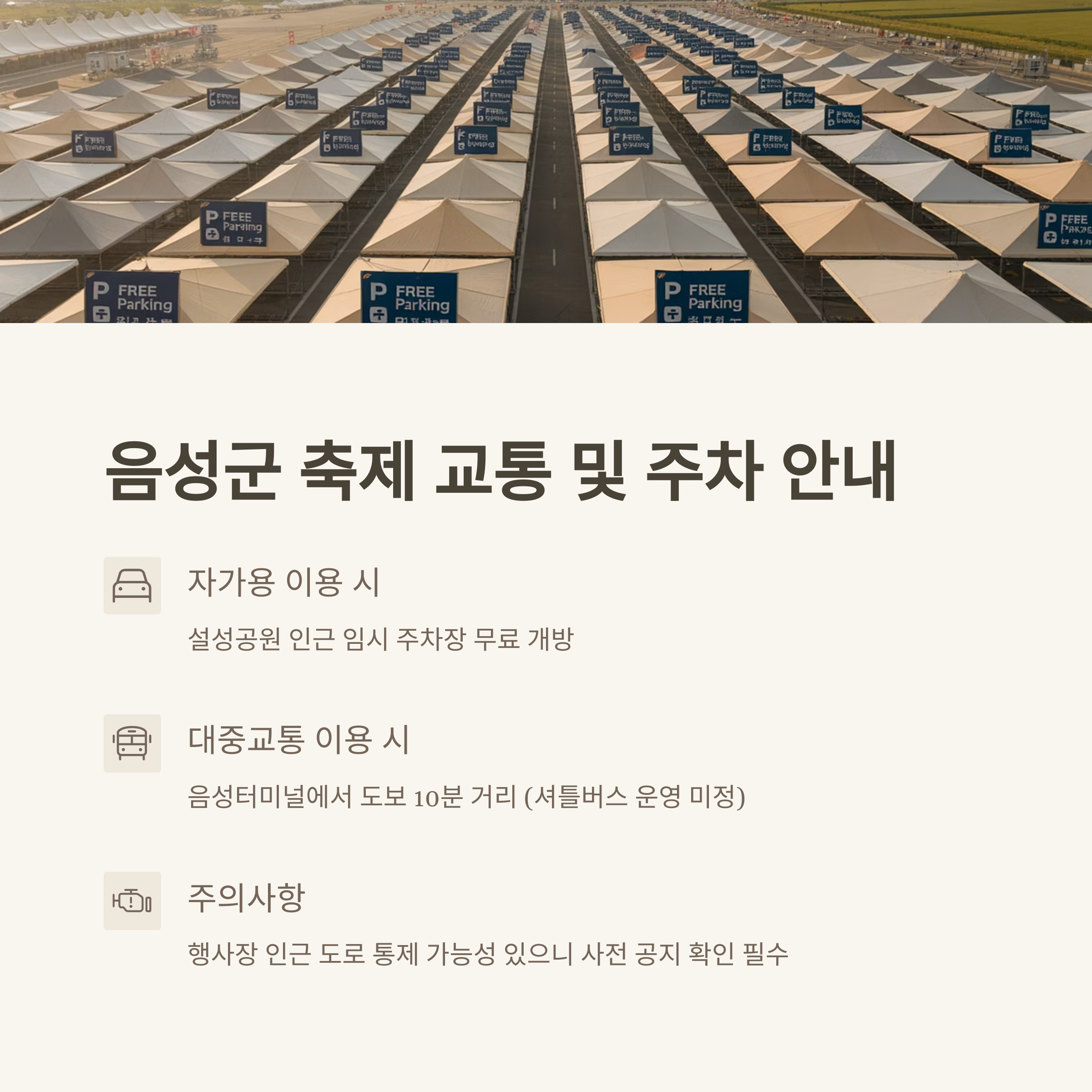- 자가용: 설성공원 인근 임시 주차장 이용 (행사 기간 무료 개방)