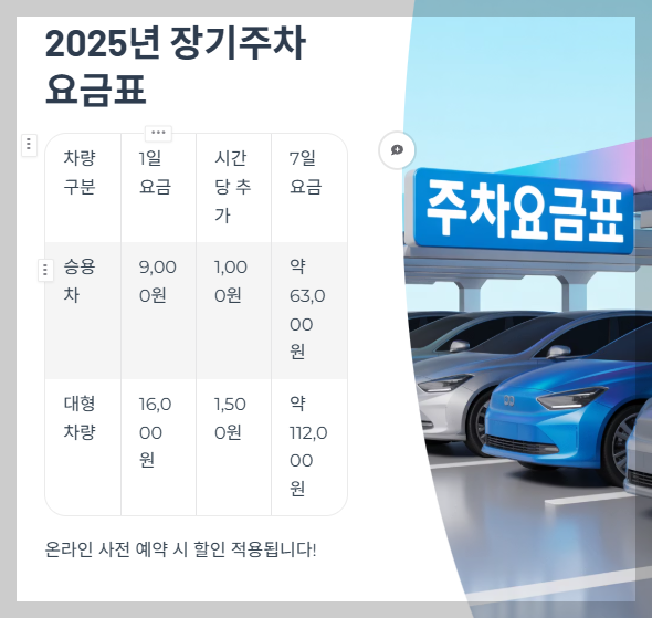 특히 짐이 많거나 동반 인원이 있을 경우, 대중교통보다는 자차 이용이 훨씬 편리하죠. 하지만 공식 장기주차장은 수요가 많아 조기 마감되는 경우가 많기 때문에 사전 예약은 필수입니다.