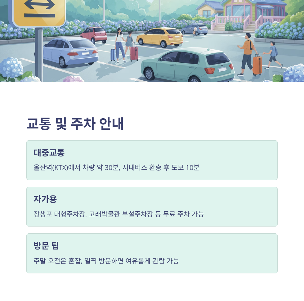 - 자가용: 고래문화마을 일원, 장생포 대형주차장(매암동 139-57), 고래박물관 부설주차장 등 무료 주차 가능