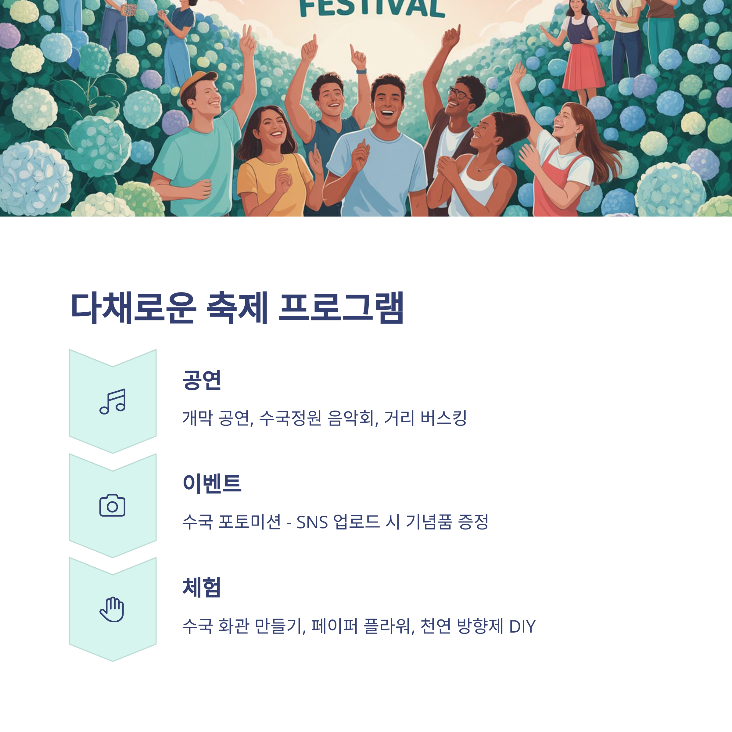 - 체험 부스: 수국 화관 만들기, 페이퍼 플라워, 천연 방향제 DIY 등