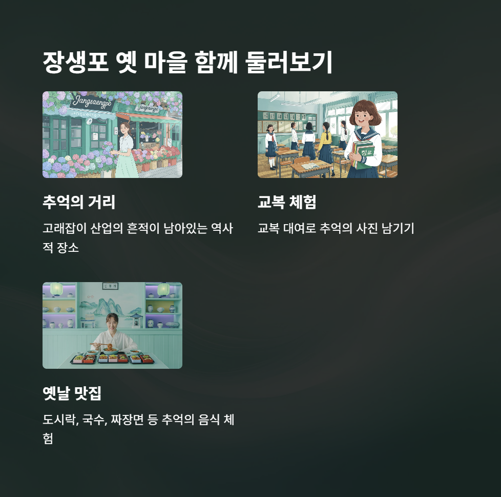 장생포 수국 페스티벌을 즐긴 후에는 고래문화마을 내 장생포 옛 마을도 꼭 방문해 보세요. 교복 대여 체험, 옛날 도시락 식당, 국수나 짜장면 등을 즐길 수 있어 아이부터 어른까지 모두 추억을 공유할 수 있는 장소입니다.