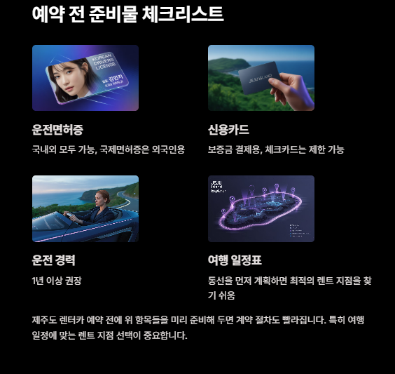 제주도 렌터카 예약 전에 위 항목들을 미리 준비해 두면 계약 절차도 빨라집니다.