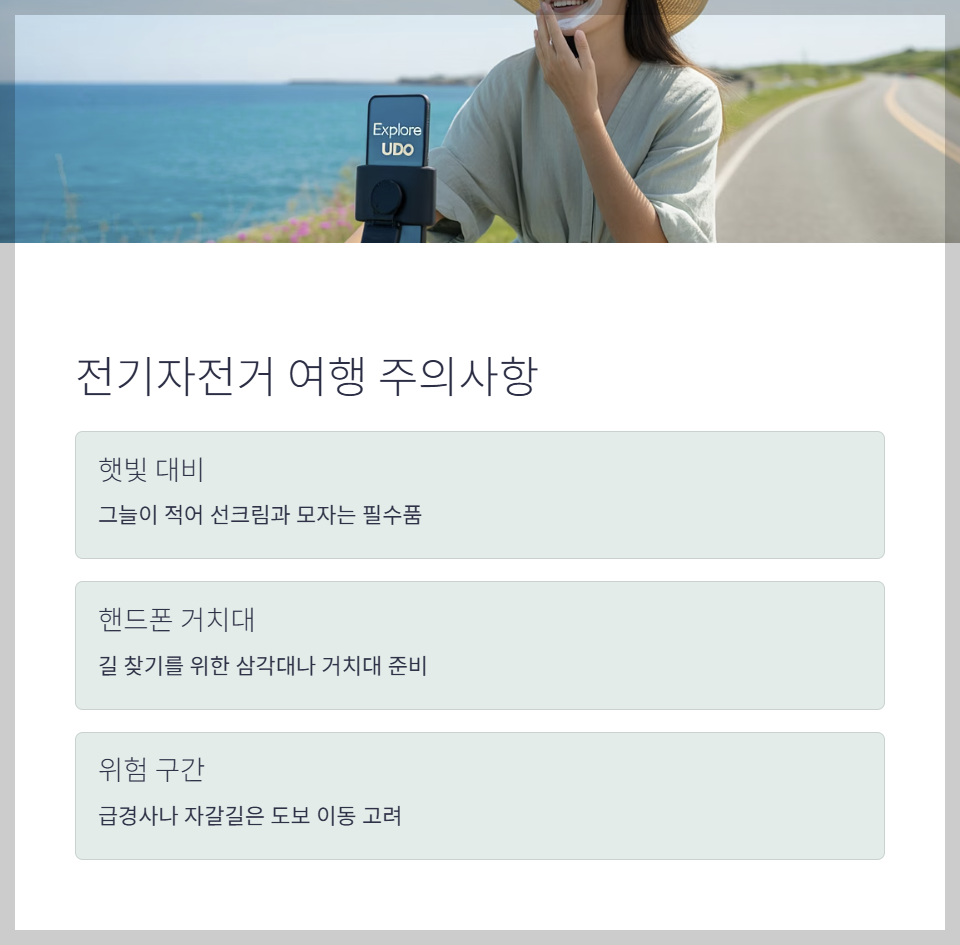 전기자전거를 이용하면 오르막길도 힘들이지 않고 이동할 수 있어 체력 부담을 줄여주고, 원하는 곳에서 자유롭게 멈춰 사진을 찍거나 바다를 감상하는 여유로운 여행이 가능합니다.