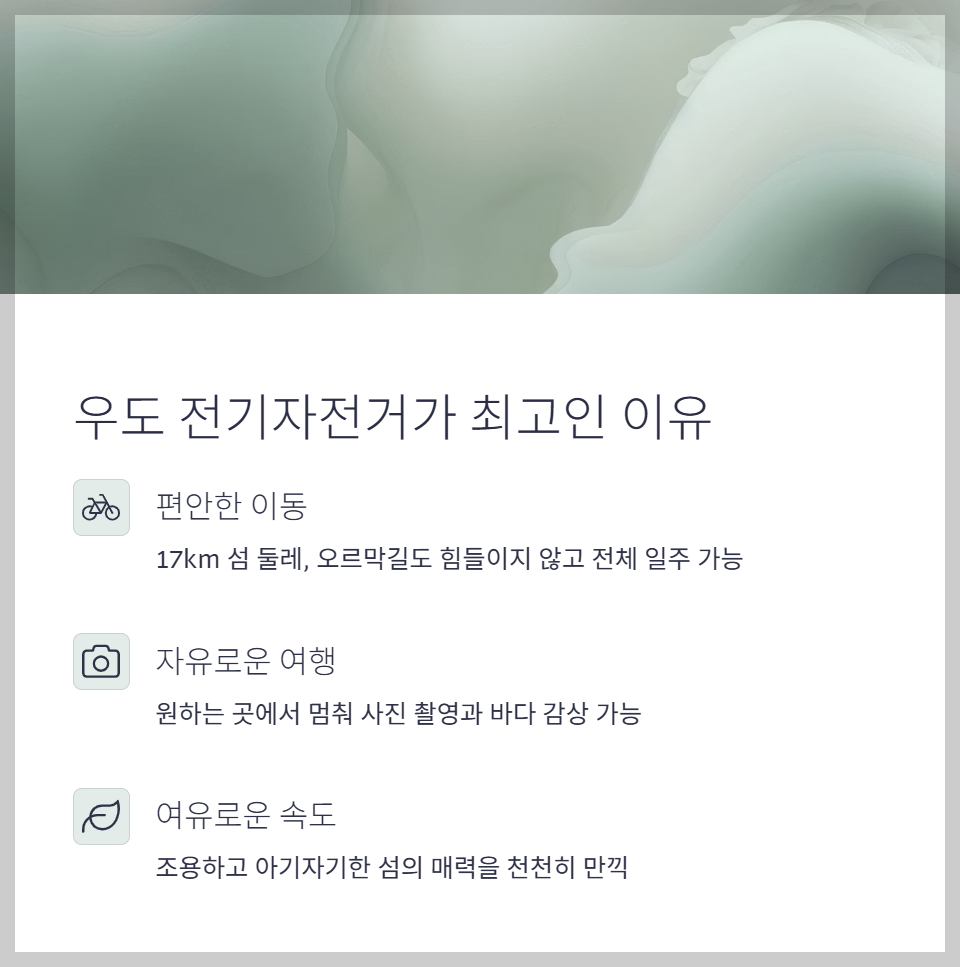 천천히 페달을 밟으며 만난 우도의 자연, 그 길 위에서의 여유로움은 오직 전기자전거로 누릴 수 있는 특권입니다. 이번 여행, 우도에서 슝슝 자전거 타며 힐링해 보세요!