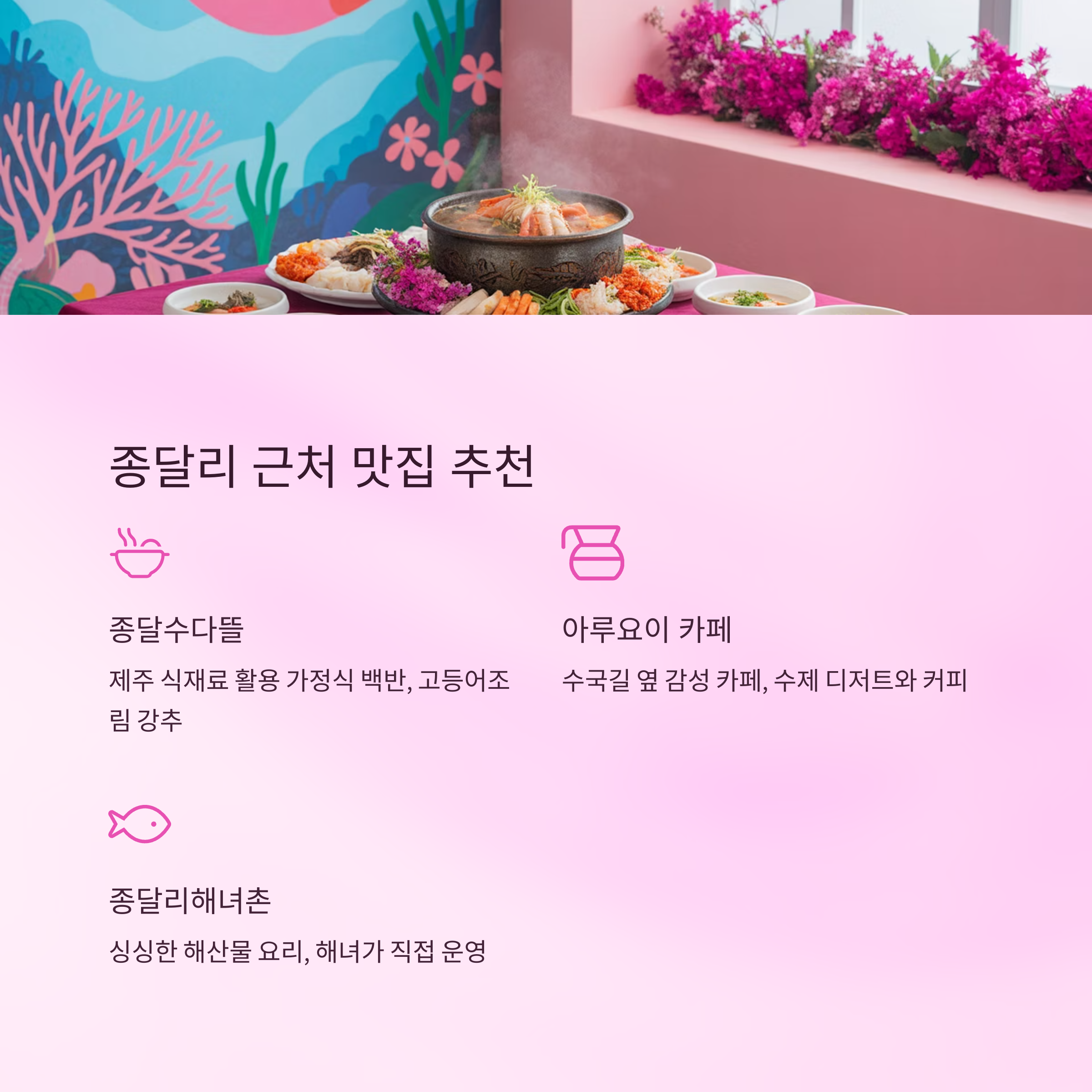 - 주민 배려 필수: 종달리는 실제 거주 마을이라 조용한 여행이 기본