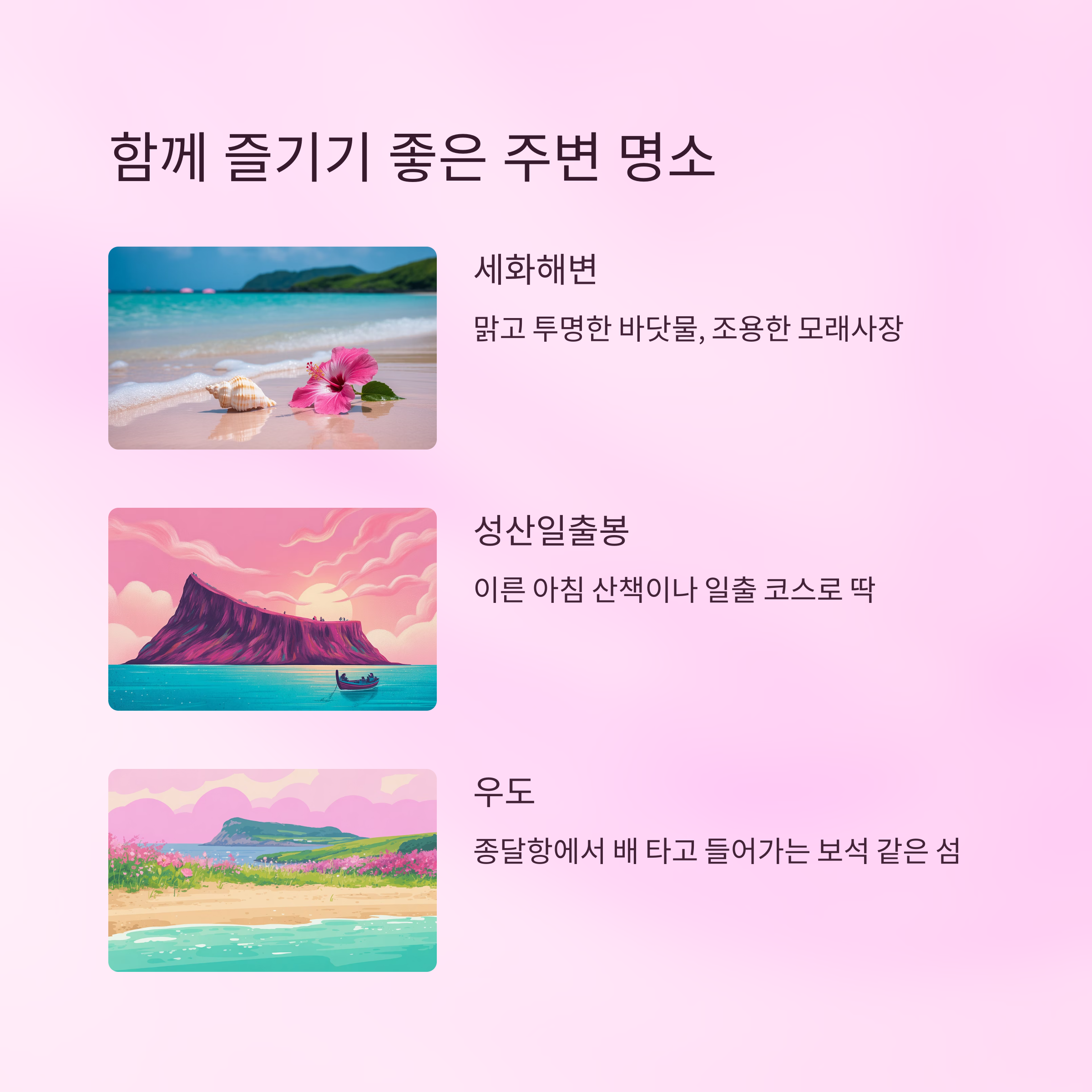 - 성산일출봉: 이른 아침 산책이나 일출 코스로 딱