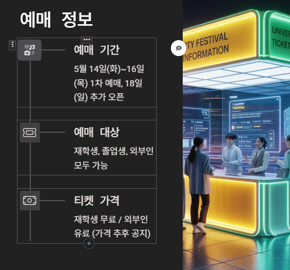 - 티켓 가격: 재학생 무료 / 외부인 유료 (가격은 추후 공지)