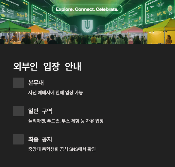 외부인의 입장 동선 및 구역 제한은 안전을 고려해 시행되며, 최종 공지는 중앙대 총학생회 공식 SNS에서 확인 가능합니다.
