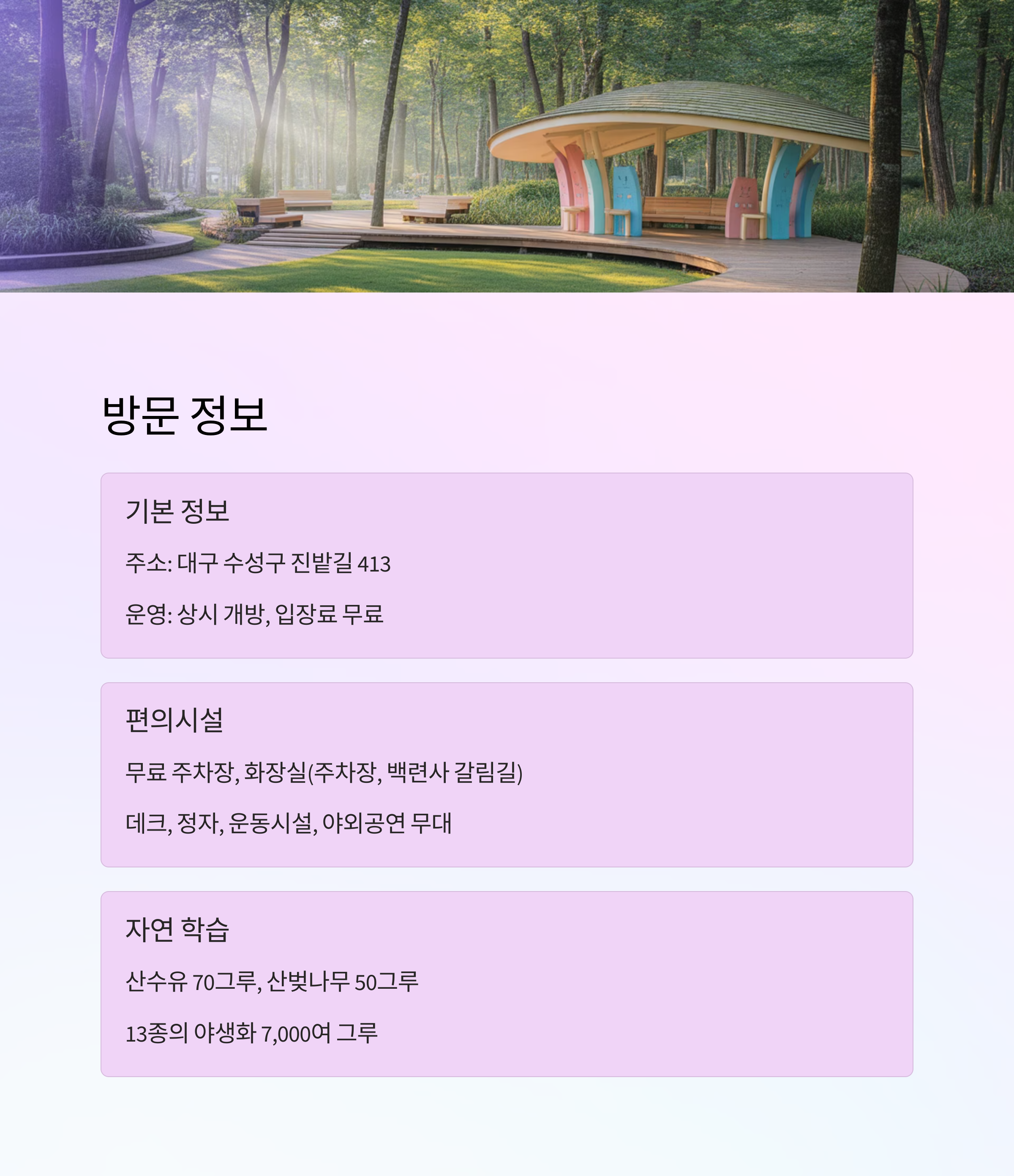 - 문의: 053-666-2861 (수성구청 공원녹지과)