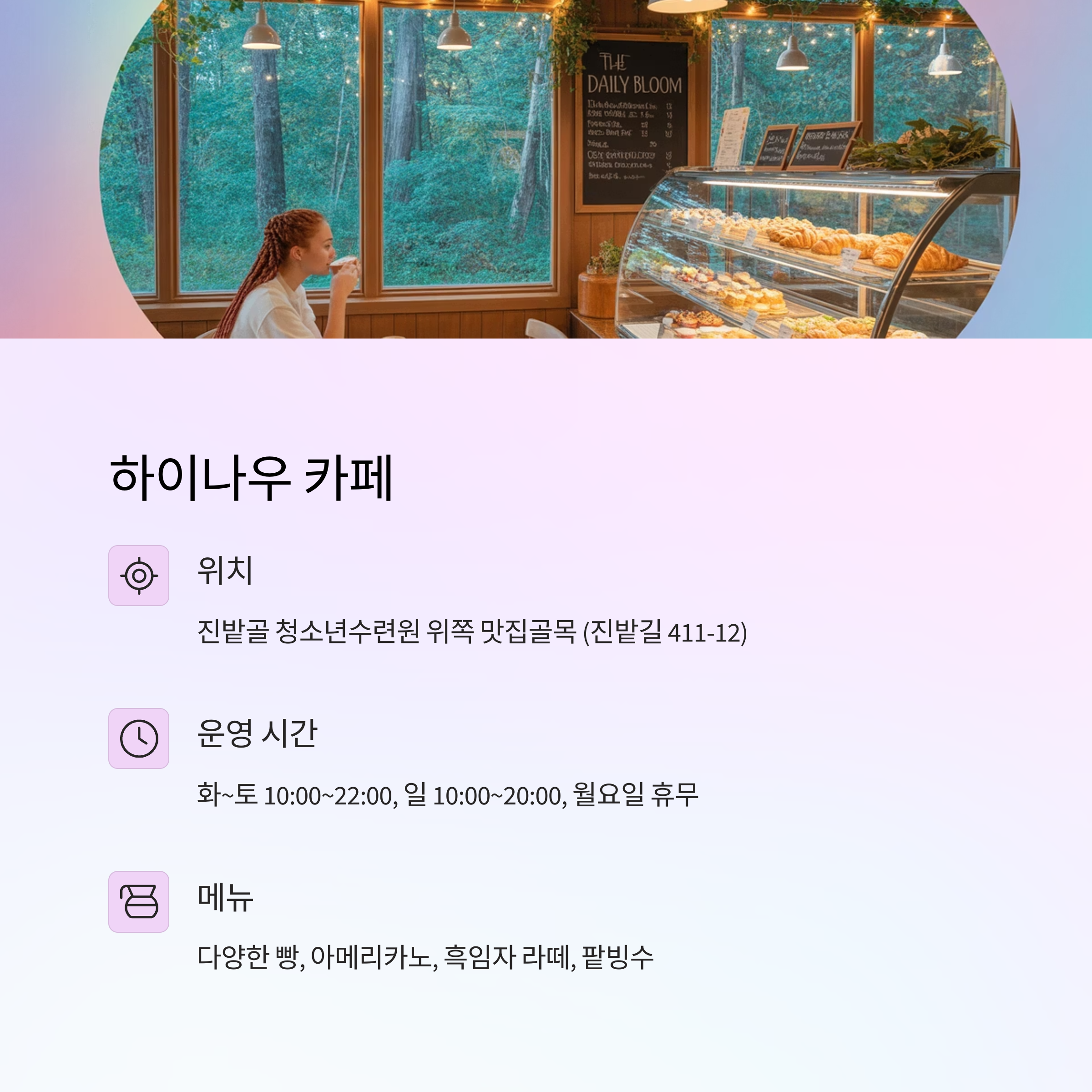 - 운영 시간: 화~토 10:00~22:00 (라스트 오더 21:00), 일요일 10:00~20:00 (라스트 오더 19:00), 매주 월요일 정기 휴무 (공휴일 월요일은 정상 운영)
