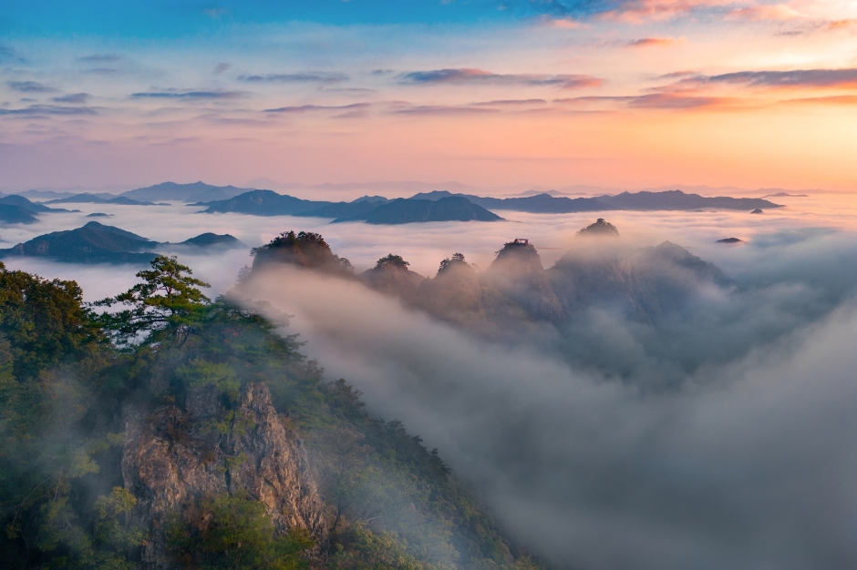 사진=대한민국구석구석 - 구봉산: 아홉 개의 봉우리가 연꽃처럼 펼쳐져 있는 모습이 인상적인 산입니다. 등산 코스를 따라 구름다리와 전망대를 지나며 진안의 자연을 만끽할 수 있죠. 특히 8봉에서 바라보는 용담호 풍경은 압도적인 아름다움을 자랑합니다.