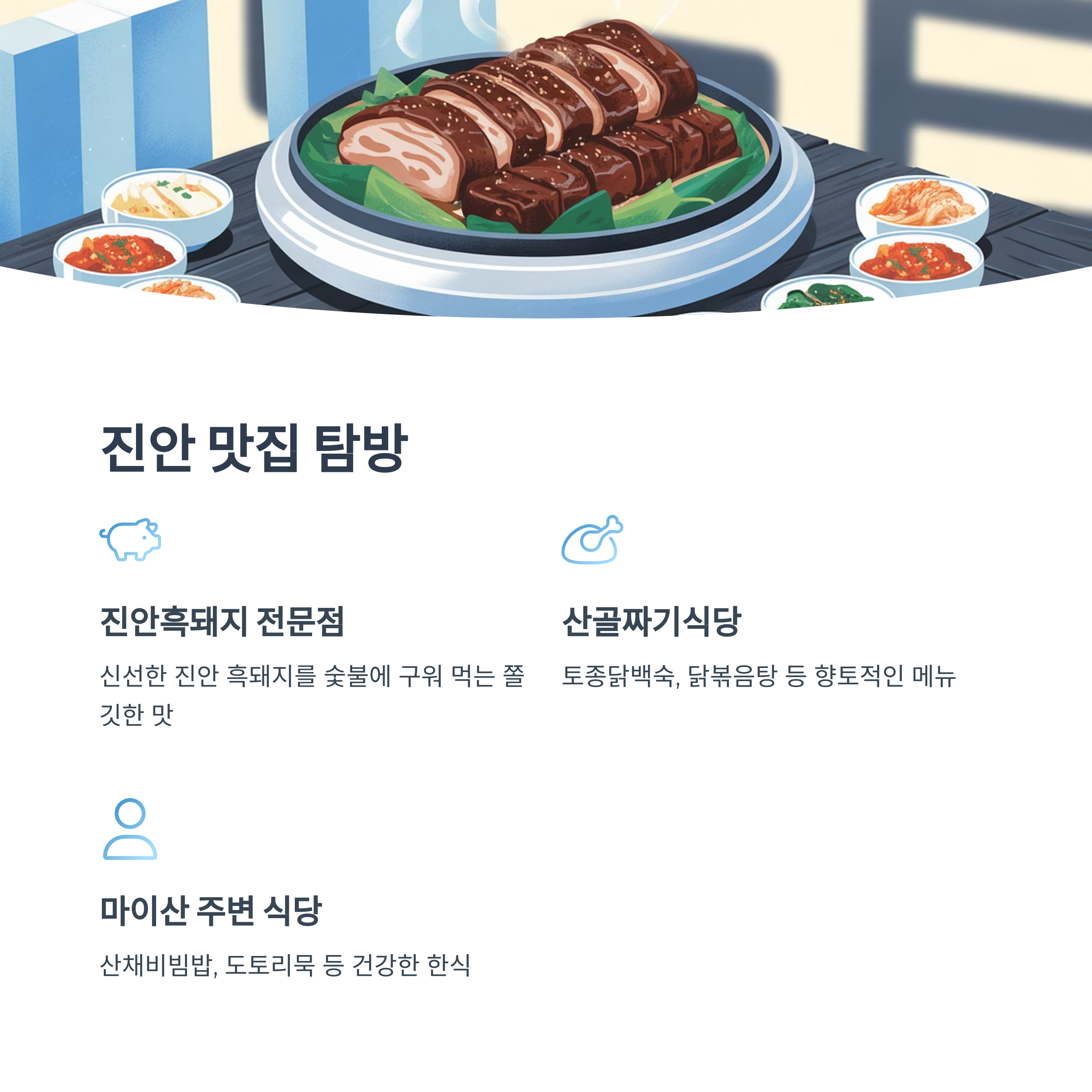 - 마이산 탑사 근처 식당들: 마이산 주변에는 산채비빔밥, 도토리묵 등 건강하고 맛있는 한식을 파는 식당들이 많으니 마이산에 들렀다가 함께 방문해 보세요.