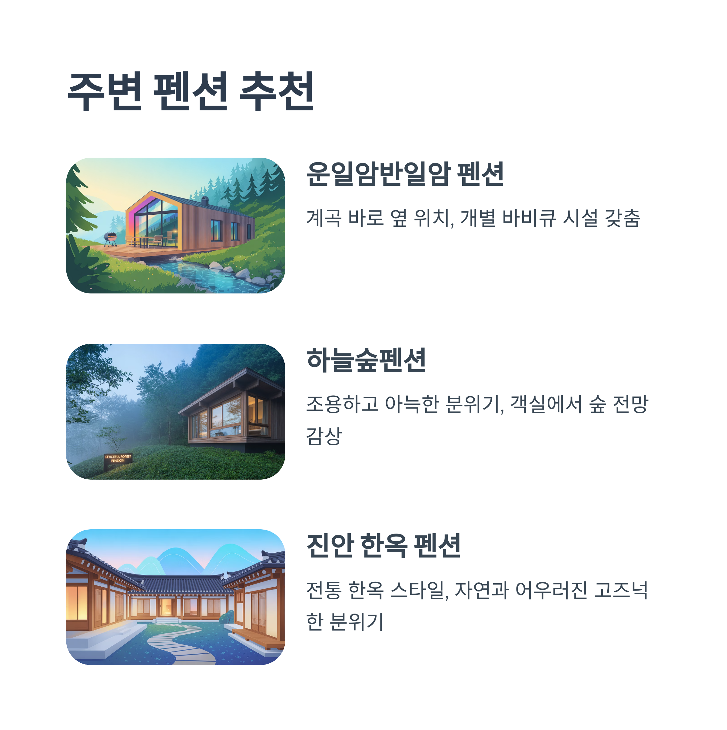 운일암반일암 인근에는 편안한 휴식을 제공하는 펜션들이 많아요. 아름다운 자연 속에서 하룻밤을 보내고 싶다면 다음 펜션들을 고려해 보세요.