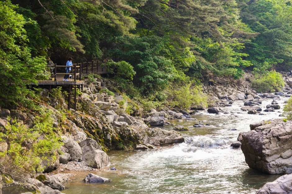 약 1,300헥타르에 이르는 광활한 자연 속에 펼쳐진 운일암반일암은 석회암 지대에 형성된 다양한 자연 동굴과 기암괴석이 인상적인 곳이에요. 계곡을 따라 흐르는 주자천의 맑은 물줄기는 계절마다 다채로운 빛깔로 여행객의 눈길을 사로잡습니다. 특히 5월 신록이 절정을 이룰 때에는 초록빛 숲과 바위, 햇살이 어우러져 환상적인 풍경을 자아내죠.