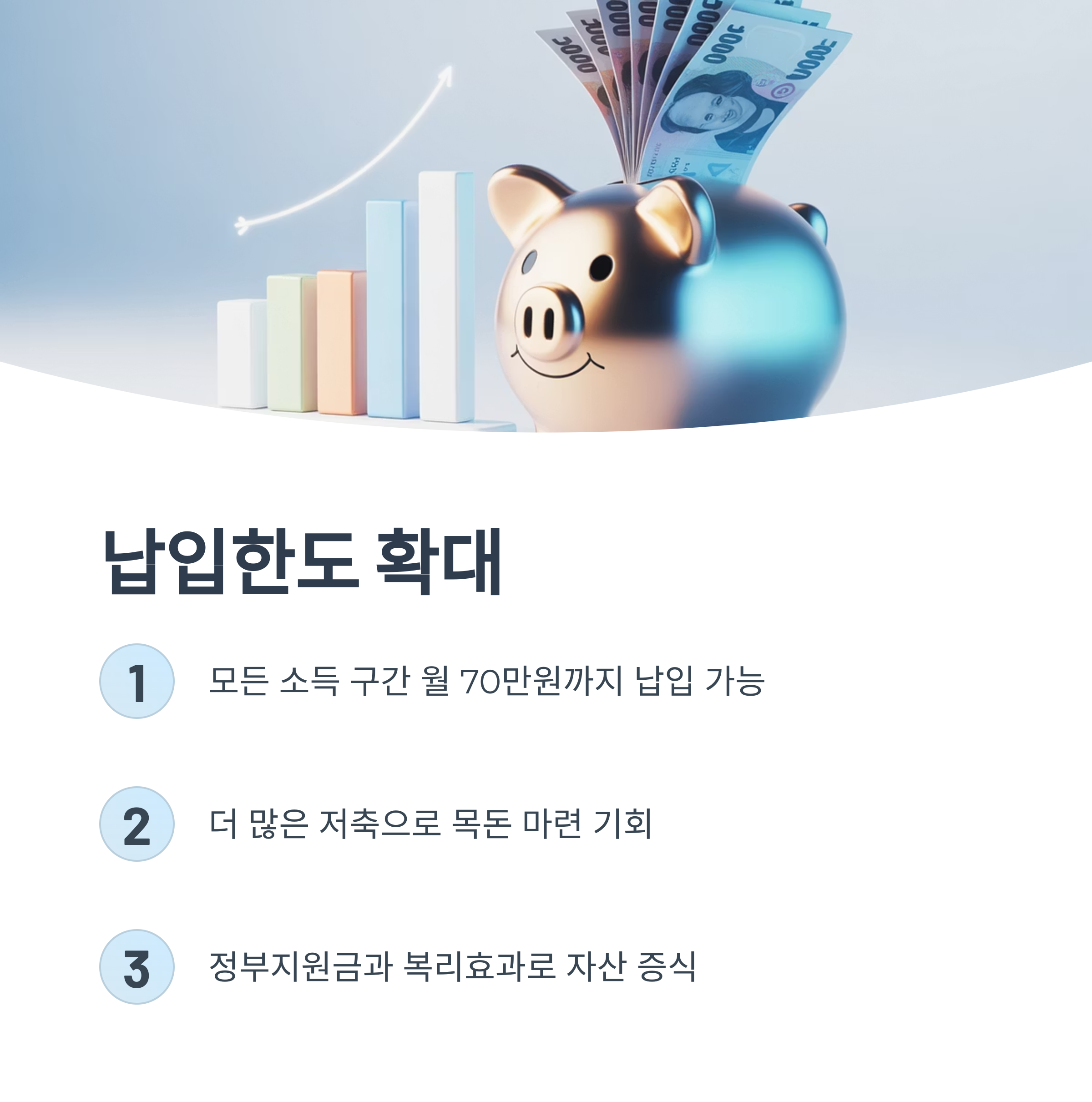 이전에는 소득에 따라 납입 가능 금액이 달랐지만, 2025년부터는 모든 소득 구간에서 월 70만 원까지 납입이 가능합니다. 자금 여유가 있는 청년은 더 많은 금액을 저축해 목돈을 마련할 수 있으며, 정부지원금과 함께 복리 효과까지 노릴 수 있어 장기 저축에 최적화된 구조입니다.
