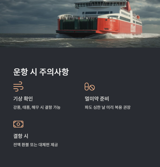 • 예매 조건: 출발 항구와 시간 정확히 입력, 신분증 정보 필요