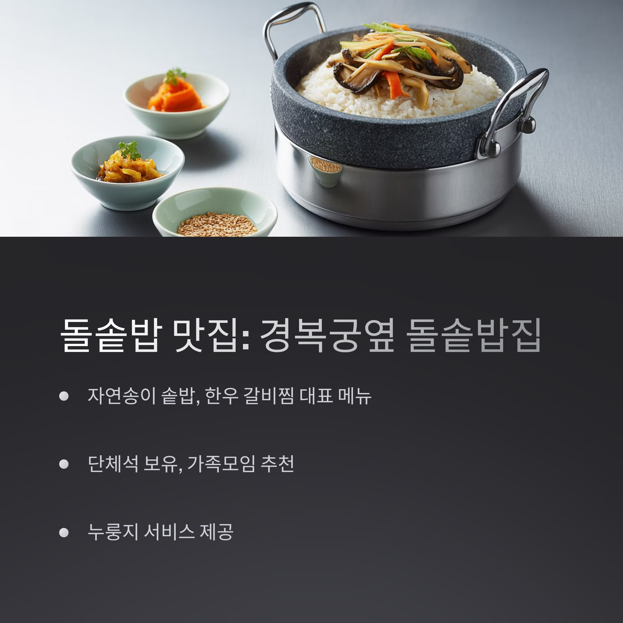 경복궁 인근 ‘경복궁옆 돌솥밥집’은 청와대 방문 후 식사 장소로 인기가 높습니다. 자연송이 솥밥, 한우 갈비찜 등이 대표 메뉴이며, 정갈한 밑반찬과 함께 제공됩니다.