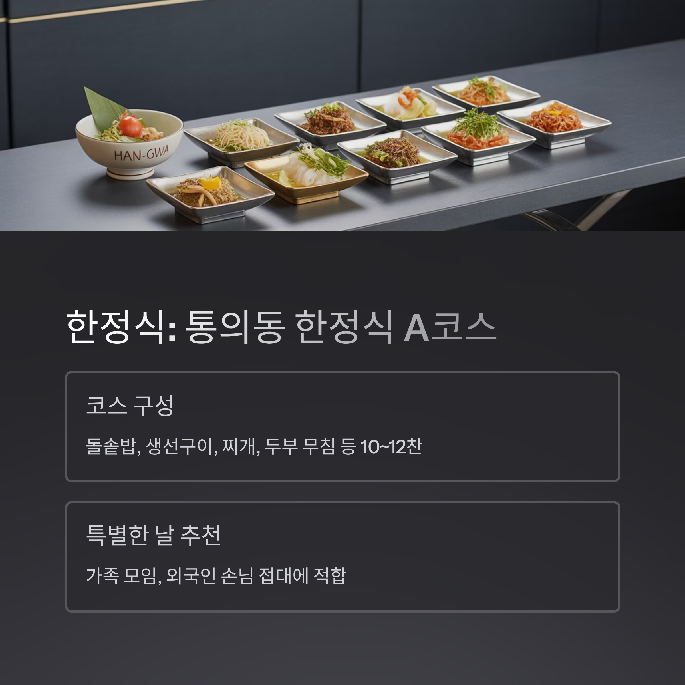 - 코스 요리를 원한다면, 한정식 추천