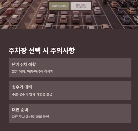 주차 시간이 길어질 경우에는 장기주차장보다 비용이 훨씬 높아질 수 있으니, 단기 체류 목적일 때만 이용하는 것이 좋습니다.