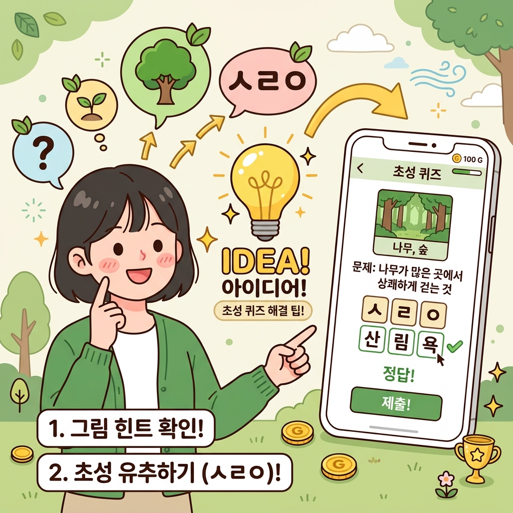 나무 두 그루가 보여주는 배경은 단순히 '숲'이라는 장소 그 이상을 의미하고 있어요. 핵심은 그 장소에서 인간이 얻을 수 있는 '혜택'이나 '행위'에 맞춰져 있는 거죠. 따라서 '나무' 이모지가 주는 평화롭고 상쾌한 느낌과 초성 힌트 'ㅅㄹㅇ'을 조합했을 때, 많은 분들이 최종적으로 '산림욕'을 정답으로 유추하게 된 셈이에요.