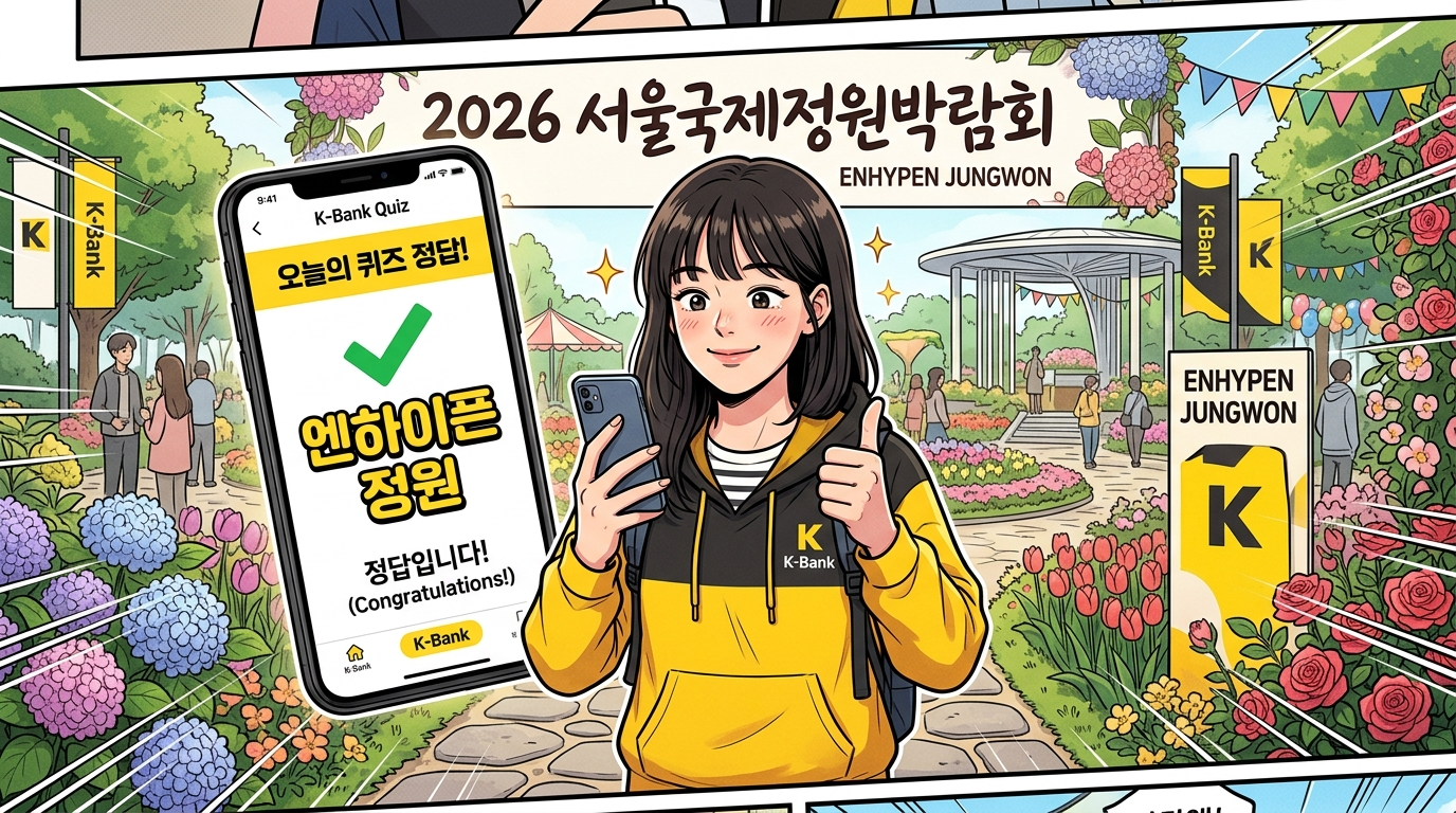 2026년 4월 28일, 케이뱅크 AI퀴즈봇 오늘의 퀴즈 정답은 '엔하이픈 정원'이에요. 2026 서울국제정원박람회 홍보대사와 관련한 문제였거든요. 매일 참여해서 소소하게 용돈 벌기 좋은 앱테크인 거 같아요.