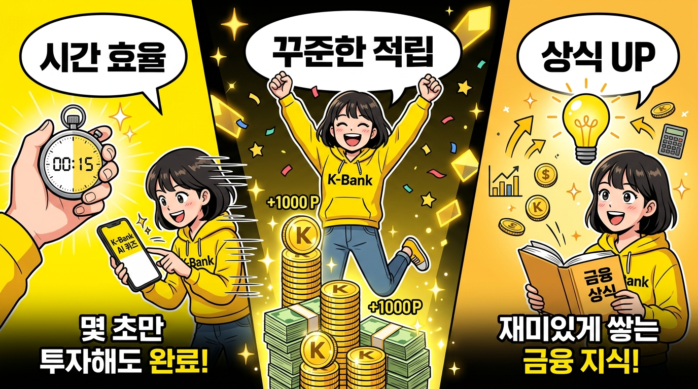 케이뱅크 AI퀴즈봇은 간단한 퀴즈를 풀고 포인트를 적립할 수 있는 앱테크 활동이에요. 금융 상식도 쌓고 소소한 용돈까지 벌 수 있다는 점이 가장 큰 매력이거든요.