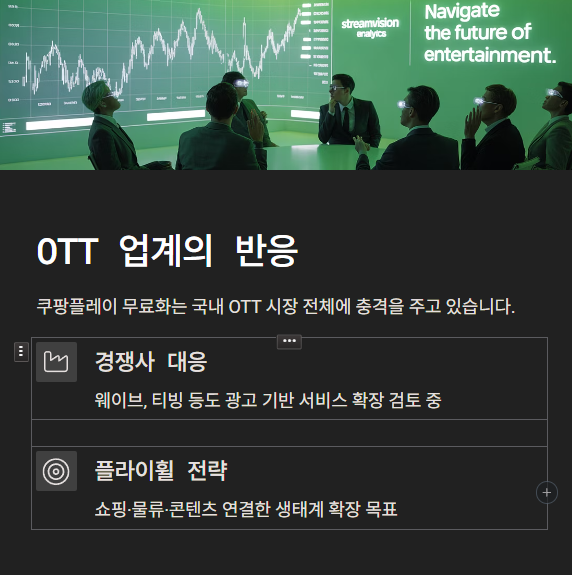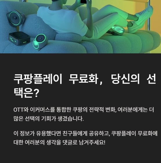 결론적으로 ‘쿠팡플레이 무료화’는 단순한 가격 인하가 아니라, OTT와 이커머스를 통합하는 대형 전략의 일부입니다.