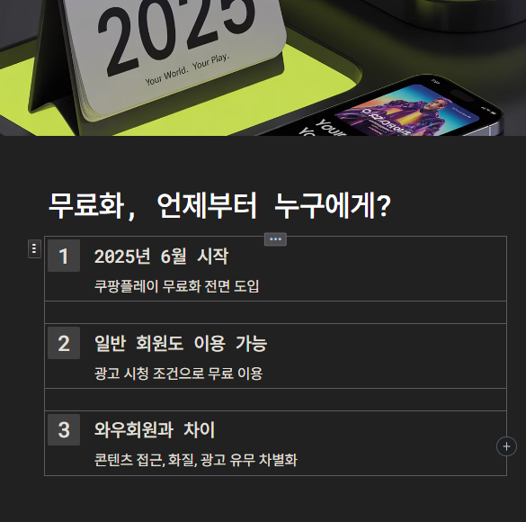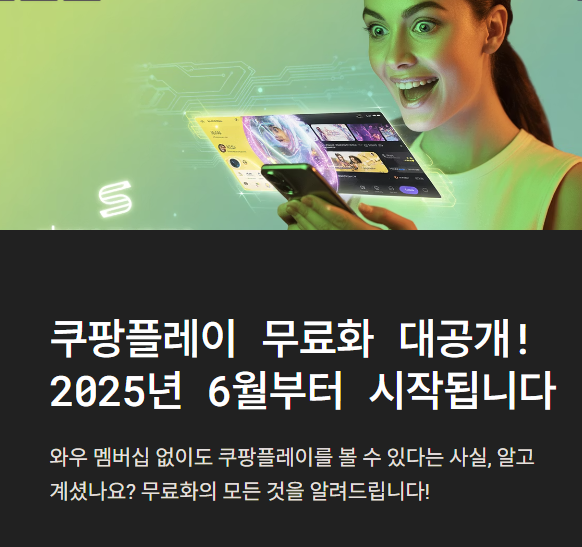 2025년 6월부터 ‘쿠팡플레이 무료’가 현실화됩니다. 이제 쿠팡 와우 멤버십 가입자가 아니어도 대부분의 콘텐츠를 시청할 수 있다는 사실, 알고 계셨나요?