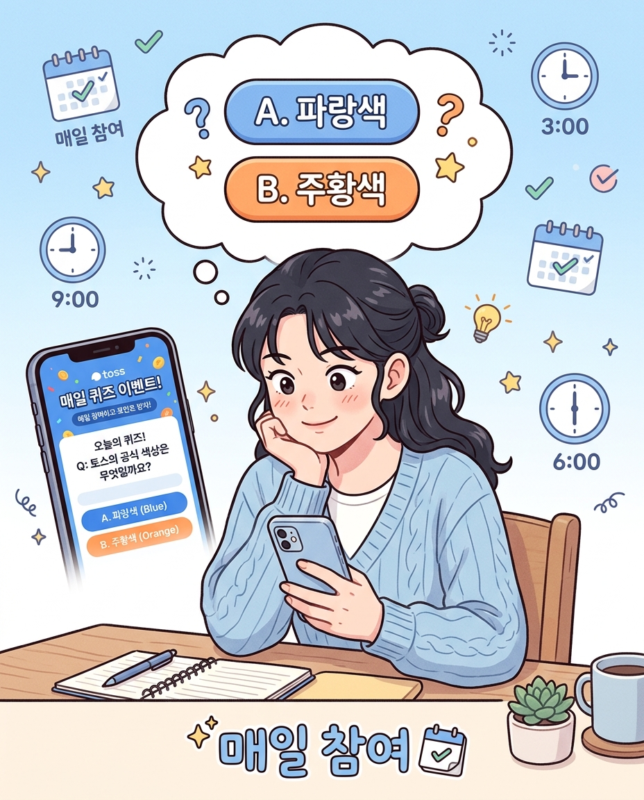 토스 '두근두근 1등 찍기' 참여는 정말 간단한데요. 토스 앱을 열고 하단의 '혜택' 탭으로 이동하면 '두근두근 1등 찍기' 배너가 보이거든요. 그걸 누르면 오늘의 퀴즈와 선택지가 뜨고, 원하는 항목을 선택해 투표하면 되는 식이에요.